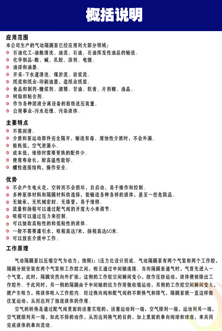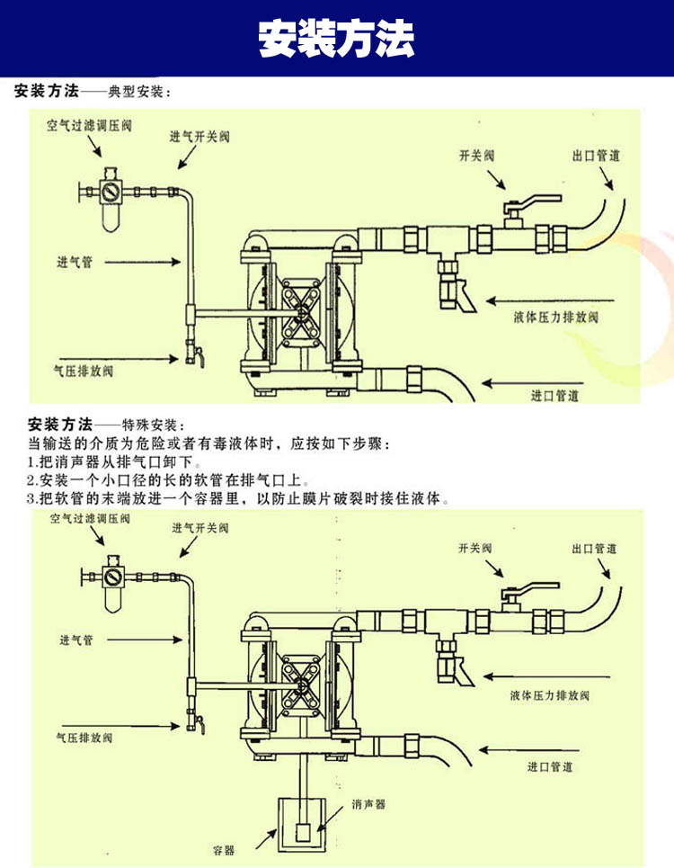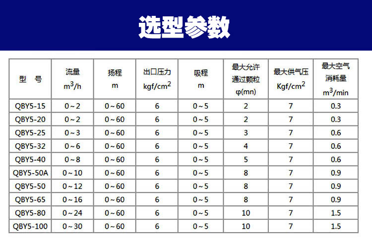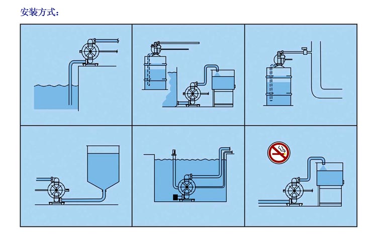 3、揚(yáng)程、流量可通過氣源壓力來調(diào)節(jié)。(氣壓壓力在0.1-0.84Mpa之間)