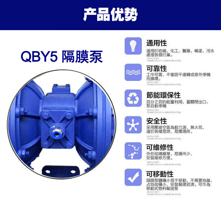 QBY5氣動(dòng)隔膜泵是我公司開發(fā)的第五代氣動(dòng)隔膜泵對(duì)美國進(jìn)口氣動(dòng)隔膜泵與國產(chǎn)氣動(dòng)隔膜泵的外形進(jìn)一步改進(jìn),機(jī)械外觀更加完美;永不死機(jī),無油氣動(dòng)隔膜泵,高吸程隔膜泵,完全替代進(jìn)口隔膜泵,國內(nèi)領(lǐng)先氣動(dòng)隔膜泵并對(duì)性能的進(jìn)一步加強(qiáng),效率更高;而且熟練的掌握QBY氣動(dòng)隔膜泵生產(chǎn)工藝使價(jià)格更加優(yōu)惠是低于同行業(yè)市場價(jià)格的10%-30%直銷進(jìn)口配件組裝美國質(zhì)量、國內(nèi)價(jià)格。歡迎選擇上球牌氣動(dòng)隔膜泵。