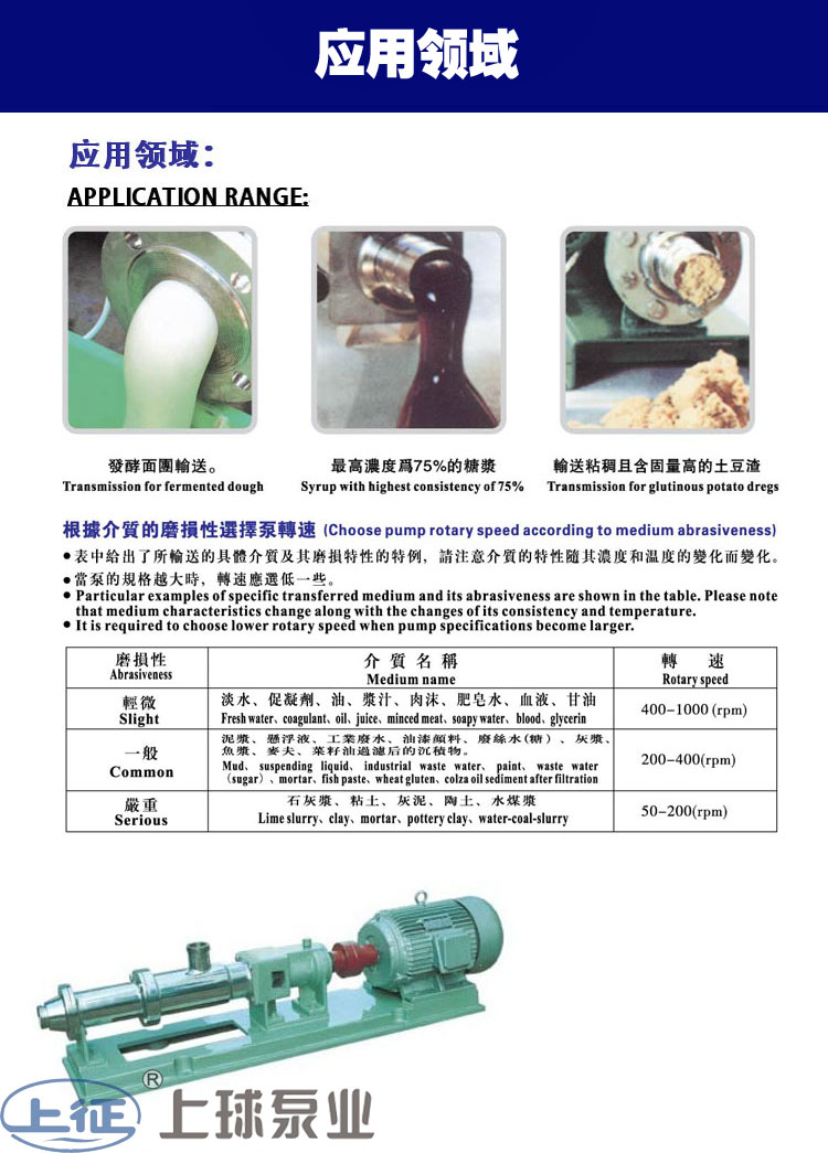 因定子選用多種彈性材料制成,所以這種泵對高粘度流體的輸送和含有硬質懸浮顆粒介質或含有纖維介質的輸送,有一般泵種所不能勝任的特點。其流量與轉速成正比。