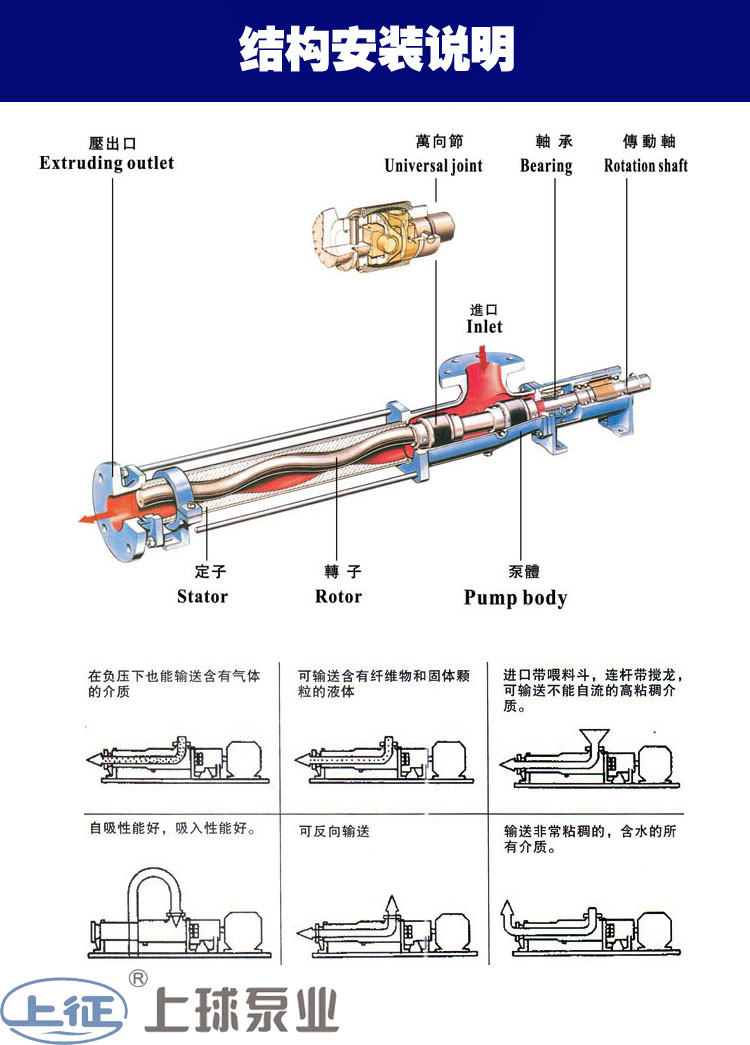 這種泵零件少,結構緊湊,體積小,維修簡便,轉子和定子是本泵的易損件,結構簡單,便于裝拆。